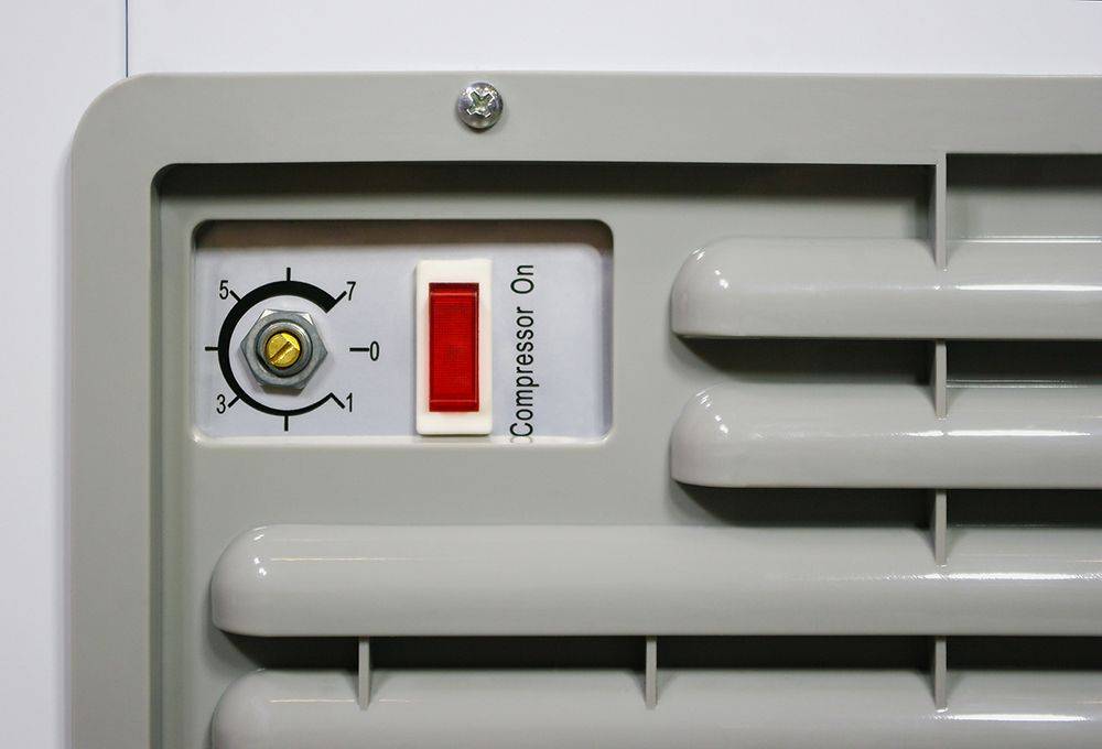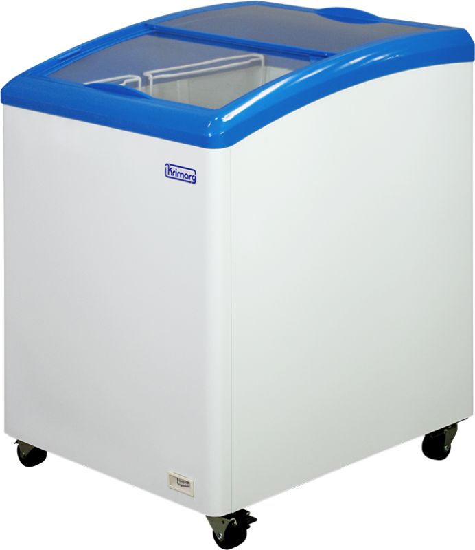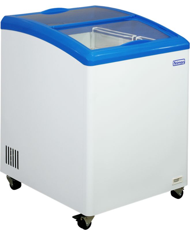 Freezer for storing ice cream and frozen food with convex, sliding windows. The standard offer it with a set of baskets and external analog thermometer.