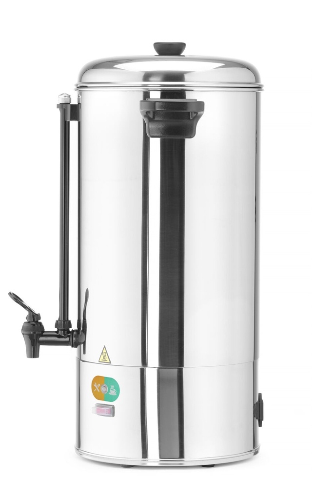 Single walled stainless steel body. Filter pan has built-in filter for coarsely ground coffee, filter paper not needed. The percolator keeps the coffee at serving temperature after brewing. With graduated glass, non-drip tap and fitted with automatic reset. The indicator light signals the end of the brewing process and if descaling is needed.