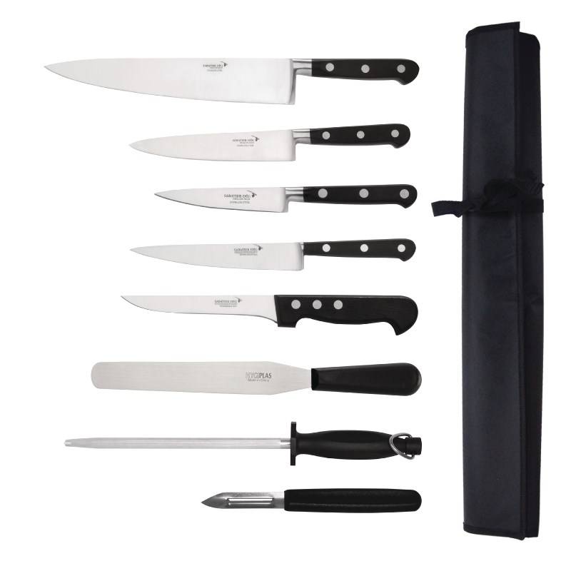 Top quality Sabatier knife set with thermoplastic handles and stainless steel blades. Supplied in black roll-up wallet with an 8" palette knife from Hygiplas and a 10" steel and peeler from Vogue. Dishwasher safe.