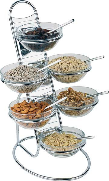 Polecana szczególnie do ekspozycji różnorakich bakalii etażera bufetowa daje wiele możliwości zastosowania. W skład zestawu wchodzą: 6 szklanych miseczek o pojemności 0,5 l, stojak ze stali chromowanej, dwa podwójne i dwa pojedyncze pierścienie do zamocowania pojemników. Poszczególne elementy do kupienia również osobno.