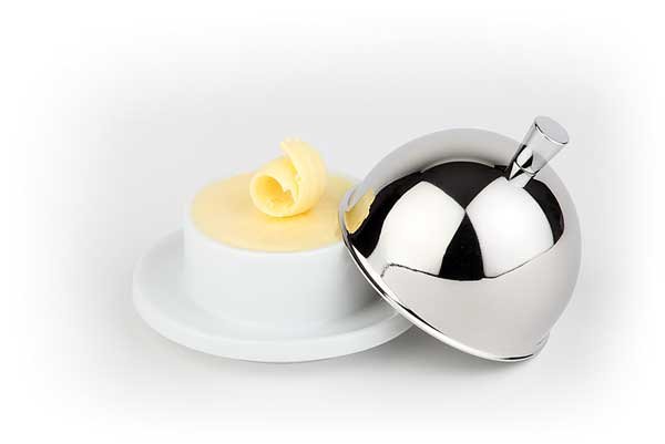 Porcelanowa maselniczka z kloszem ze stali nierdzewnej. Można myć w zmywarkach.