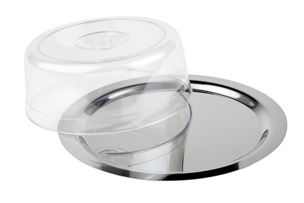 W skład zestawu wchodzą: taca z rantem gładkim wykonana ze stali nierdzewnej o średnicy 380 mm oraz przeźroczysta pokrywa z tworzywa. Można myć w zmywarkach i sztaplować.