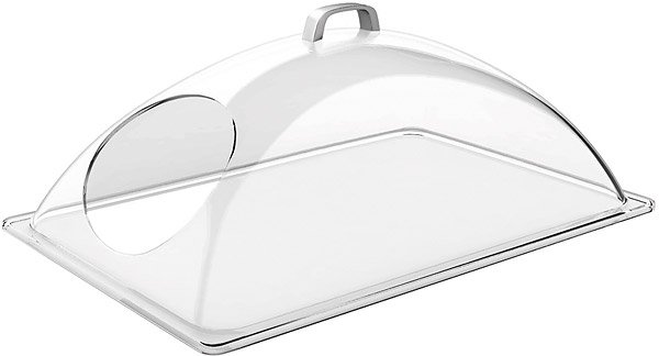 Pokrywa na pojemniki lub tace w standardzie GN 1/1. Wykonana z przeźroczystego tworzywa, z otworem z boku i uchwytem wykonanym ze stali chromowanej. Można piętrować oraz myć w zmywarce.