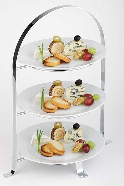 Stand wykonany ze stali chromowanej na trzy okrągłe talerze o maksymalnej średnicy 270 mm. Średnica obręczy podtrzymującej naczynie wynosi 180 mm. Talerze sprzedawane oddzielnie.
