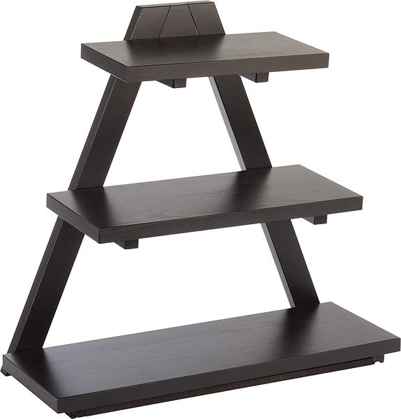 Stand bufetowy wykonany z drewna w kolorze wenge. Wymiary półek od góry: 300x150 mm, 400x175 mm, 530x190 mm. Stand nie zawiera misek w komplecie.