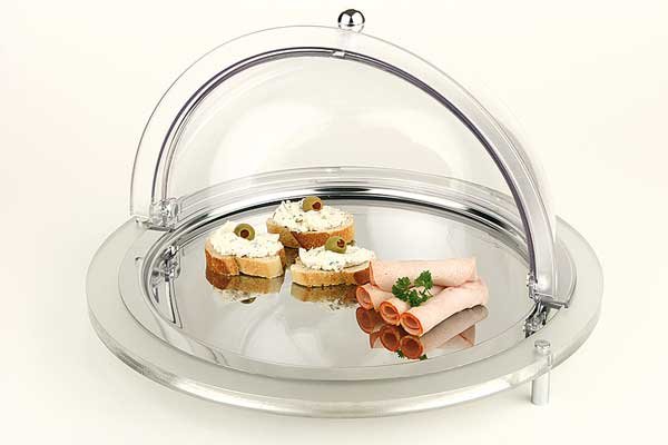 W skład zestawu wchodzą: solidna akrylowa podstawa, taca ze stali nierdzewnej o średnicy 380 mm, głęboka taca ze stali nierdzewnej oraz wkład chłodzący z tworzywa, pozwalający zachować długotrwałą świeżość. Pokrywa sprzedawana oddzielnie. Wysoka jakość.