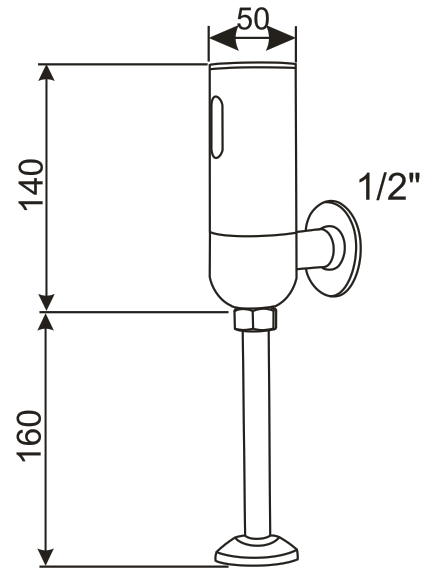 Elektroniczny, naścienny automat spłukujący do pisuaru sterowany fotokomórką. Automat wyposażony w zawór odcinający i regulujący wielkość przepływu. Zasilanie standardową baterią 9V. Zasięg działania czujnika fotokomórki 50-60 cm. Przyłącze 1/2″.