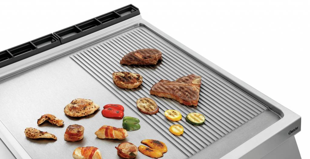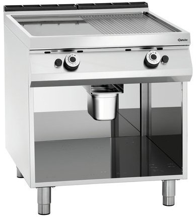 Gazowa płyta grillowa 755 x 760 mm, gładka/ryflowana, 2 strefy grzewcze, 18 kW na podstawie półotwartej