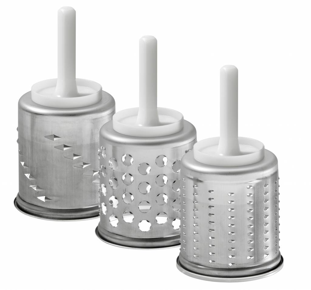 | Skład zestawu | 1 bęben z drobnymi otworami (do ścierania sera, orzechów i bułki tartej) 1 bęben koronowy (do ziemniaczanego purée, tarty i cebuli) 1 bęben do cięcia w słupki (do długich słupków) |