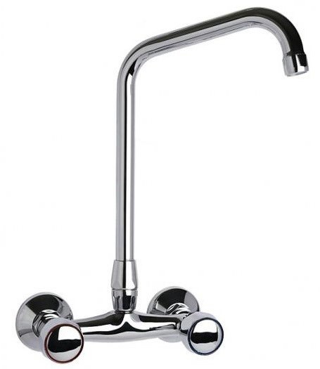Bateria zlewozmywakowa ścienna z pokrętłami. Wylewka obrotowa. Głowice baterii suwakowe. Przyłącza – standardowe mimośrody. Rozstaw króćców przyłączeniowych 150 mm.