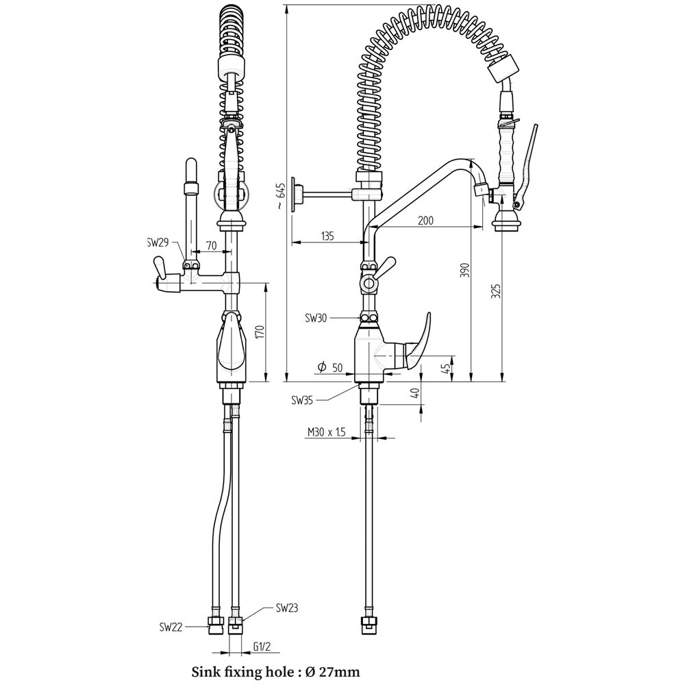 Słuchawka natryskowa osadzona jest na elastycznym wężu ze sprężyną prowadzącą, co zapewnia szeroki zakres ruchu i szybki powrót do pozycji spoczynkowej. Jej ergonomiczny uchwyt i dźwignia spustowa umożliwiają wygodne sterowanie strumieniem bez konieczności ciągłego odkręcania wody. Główna bateria sterowana jest uchwytem łokciowym, który pozwala zachować wysoki poziom higieny przy obsłudze – idealne rozwiązanie w środowiskach gastronomicznych.