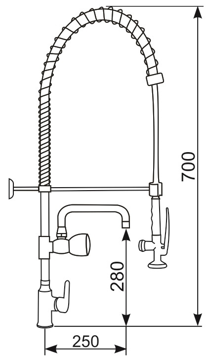 Bateria zlewozmywakowa stojąca, jednootworowa, jednouchwytowa, ze spryskiwaczem, obrotową wylewką górną typu “C” i wspornikiem mocującym baterię do ściany. Możliwość regulacji dystansu baterii od ściany. Bateria wyposażona w dwa zawory zwrotne oraz elastyczne wężyki przyłączeniowe w oplocie stalowym. Przyłącza 3/8″.