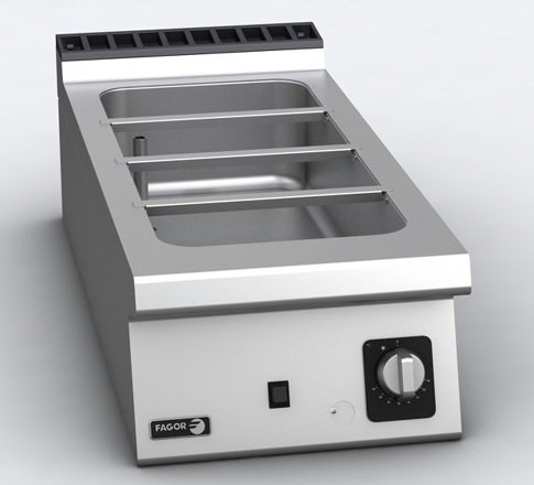 Zbiornik 22l. przystosowany do pojemników GN (max. głębokość pojemników: 150 mm). Napełnianie wodą za pomocą elektrozaworu. Posiada wbudowaną w dno płytę perforowaną i trzy poprzeczki. Zakres temperatury pracy 30–90°C sterowany termostatem. Rurka przelewowo-spustowa. Piezoelektryczne odpalanie palników. TACE GN NIE WYSTĘPUJĄ W KOMPLECIE.Podmiot odpowiedzialny (GPSR):