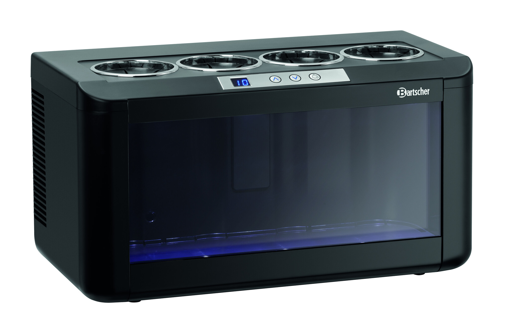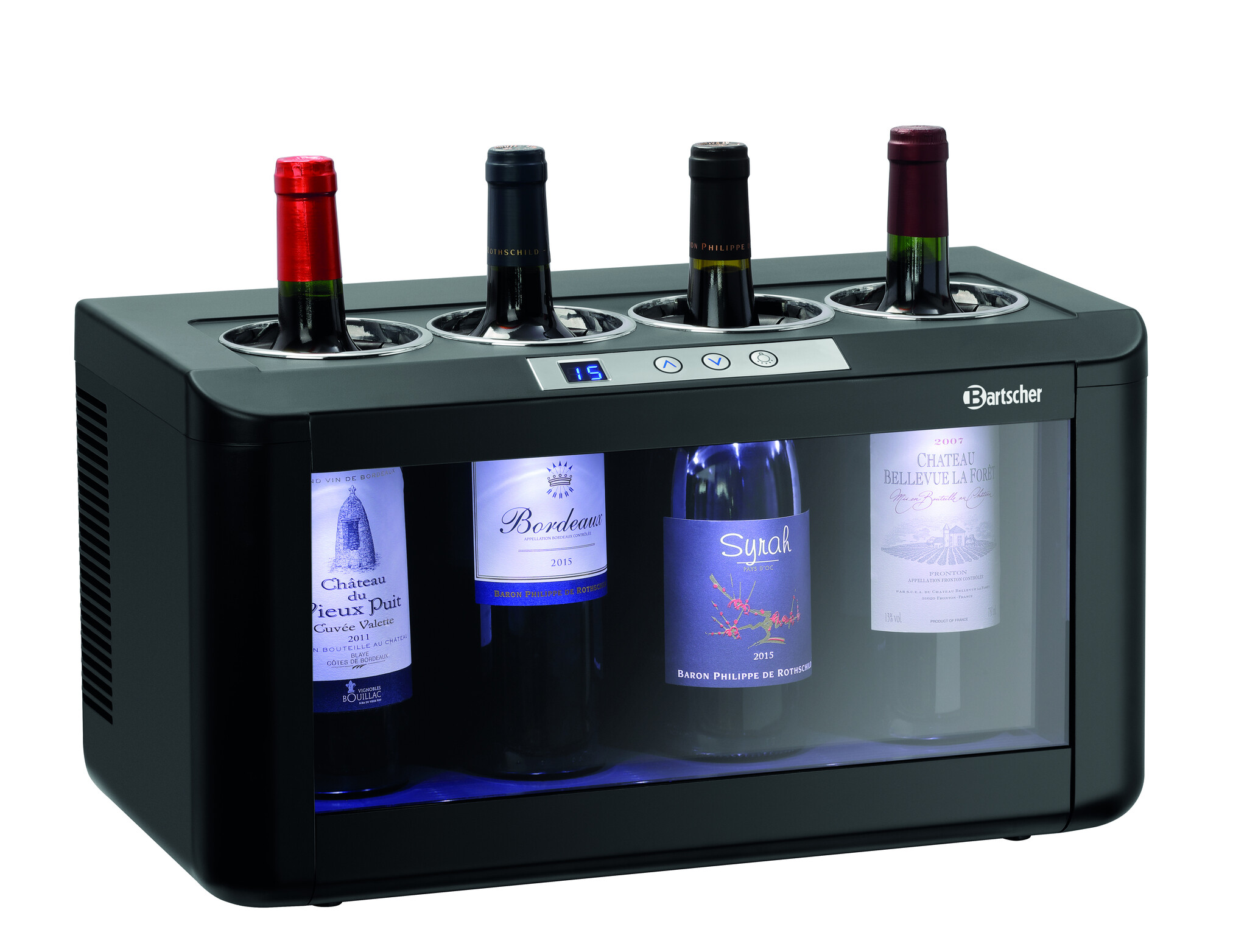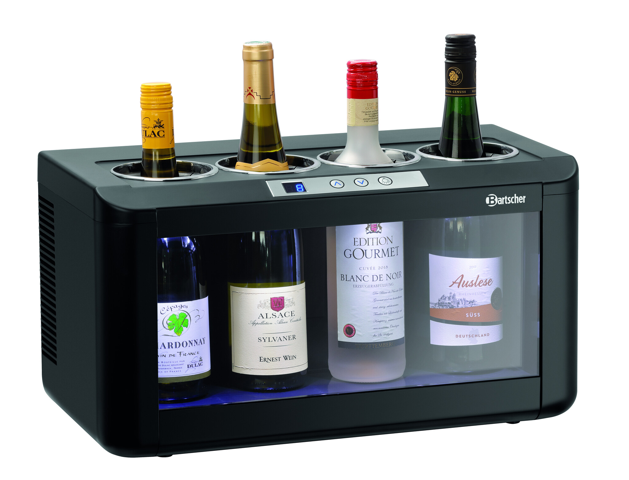 Zajmująca niewiele miejsca i wyróżniająca się eleganckim designem chłodziarka do wina z oświetleniem LED. Możliwość reprezentacyjnego przechowywania 4 butelek białego, różowego lub czerwonego wina w obrębie jednej strefy temperaturowej w dyspenserze do win, a także w bufecie, przy barze lub podczas degustacji wina.Podmiot odpowiedzialny (GPSR):