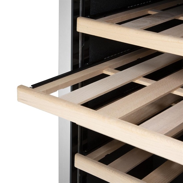 Szafa chłodnicza na wino Polar G-Series to profesjonalne rozwiązanie dla restauracji, barów i hoteli, które przechowują szeroki asortyment win w stałej, kontrolowanej temperaturze. Została zaprojektowana z myślą o maksymalnej pojemności i łatwej organizacji – umożliwia składowanie nawet 118 butelek w klasycznym bordoskim formacie, rozmieszczonych na 14 wyjmowanych drewnianych półkach.