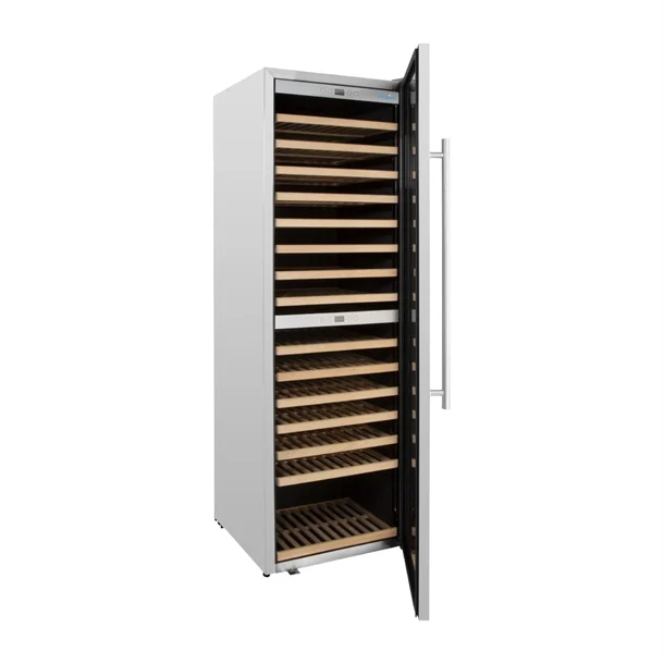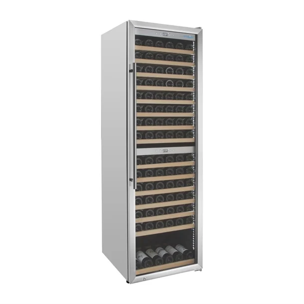 Profesjonalna chłodziarka na wino Polar G-Series Dual Zone to połączenie dużej pojemności, precyzyjnej kontroli temperatury i stylowego, nowoczesnego wykończenia. Zaprojektowana z myślą o restauracjach, barach, klubach oraz wymagających strefach serwisu w hotelach i winebarach, umożliwia przechowywanie do 172 standardowych butelek wina na 15 półkach.
