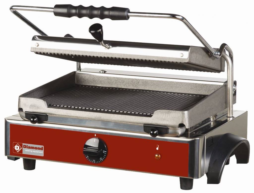 Opiekacz do panini z obudową wykonaną z kwasoodpornej stali AISI 304 i żeliwnymi płytami grzewczymi. Urządzenie wyposażono w pokrętło regulacyjne, szufladę na tłuszcz, lampkę kontrolną i uchwyt z nienagrzewającym się uchwytem. Temperaturę można regulować w zakresie do 250 °C.