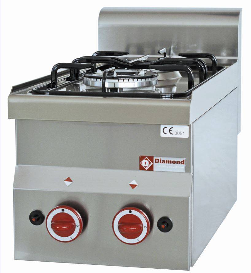 Nastawna kuchnia gazowa wykonana z kwasoodpornej stali nierdzewnej AISI 304. Posiada 2 mosiężne palniki, jeden o mocy 3300 W a drugi o mocy 3600 W, zapłon piezolektryczny oraz ruszt z emaliowanego żeliwa. Moc regulowana jest ergonomicznymi pokrętłami.
