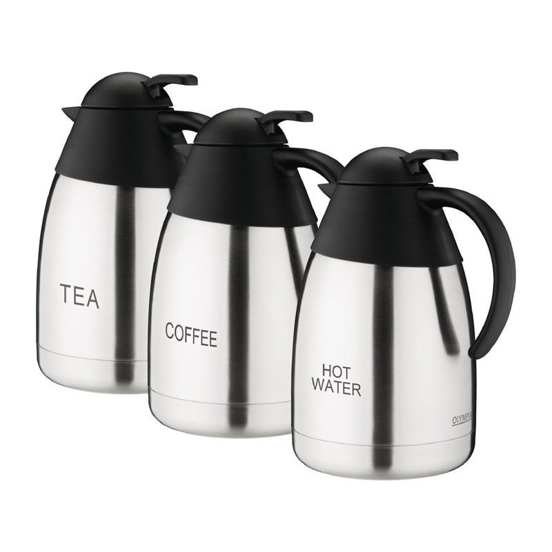 izolowanej 1½ l dzbanki o zawartości etykieta trawienie. Podwójne ścianki korpusu ze stali nierdzewnej z dźwignią kciuka do kontrolowanego dozowania. 230 (H) x 140 mm (o).