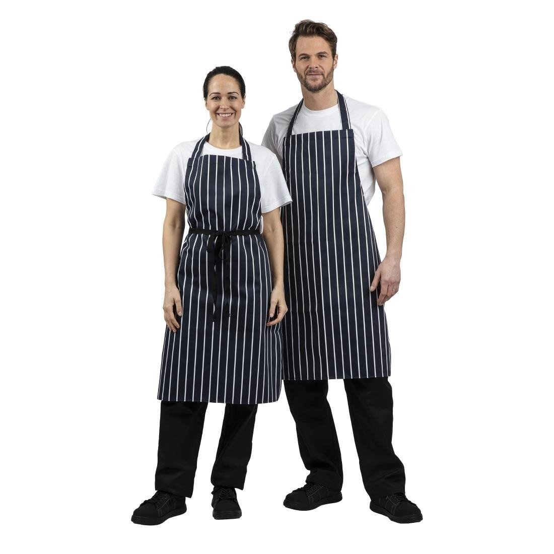 - Granatowy kolor z eleganckimi białymi paskami – klasyczny wygląd rzeźnicki