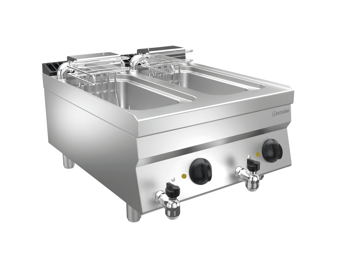Frytownica z serii 700FX zapewnia najwyższą elastyczność – może być używana jako urządzenie nablatowe lub wolnostojące. Dla ułatwienia czyszczenia obydwie komory 10-litrowe modelu elektrycznego jest wyposażona w wychylany element grzewczy i kranik spustowy do tłuszczu.Podmiot odpowiedzialny (GPSR):