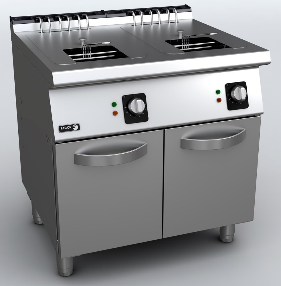 Powierzchnia wykonana ze stali nierdzewnej AISI-304 o grubości 1,5 mm. Powierzchnia wycięta za pomocą robota spawalniczego ,który dodatkowo poleruje powierzchnię. Zimna strefa w dolnej części frytownicy, która wydłuża żywotność oleju oraz zapobiega przypalaniu elementów, które spadają na dno komory. Termostatyczna kontrola temperatury, od 60 do 200 ° C. Wyposażony w indywidualne pokrywy dla każdej komory smażenia.Spuszczanie oleju z komory przez mechaniczny zawór kulowy, który jest solidny, niezawodny i odporny na wysokie temperatury. Urządzenie o dużej mocy, które szybko się nagrzewa i ma wysoki stosunek mocy do litra (do 1,00 kW / litr). Model elektryczny z elementami grzewczymi ze stali nierdzewnej AISI 304 umieszczonymi wewnątrz komory, które można przechylać o ponad 90 °, aby zapewnić idealne czyszczenie. Liczba komór: Dwie z 15 litrami pojemności, 2 duże kosze (250 x 280 x 100 mm).Podmiot odpowiedzialny (GPSR):