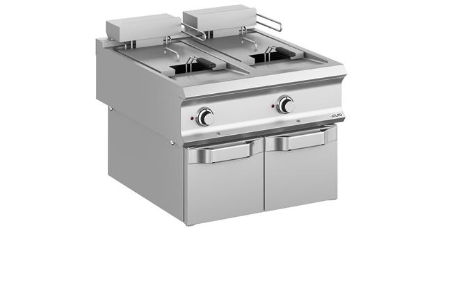 Blat ze stali nierdzewnej AISI 304 18/10 o grubości 2 mm Komory ze stali nierdzewnej głęboko tłoczonej AISI 304 o szerokim promieniu, ułatwiające czyszczenie Ciągłe spoiny komór (bez szczotkowania), co zapewnia wytrzymałe łączenie Wszystkie modele wyposażone w termostat bezpieczeństwa Duża „strefa zimna“, pozwalająca utrzymać niezmienioną jakość oleju przez dłuższy czas i zapewniająca łatwiejsze usuwanie pozostałości po smażeniu Nagrzewanie elektryczne za pomocą elementu grzejnego ze stali nierdzewnej AISI 304 znajdującego się wewnątrz urządzenia, obracanego o 90°, co umożliwia dokładne mycie komory frytownicyPodmiot odpowiedzialny (GPSR):