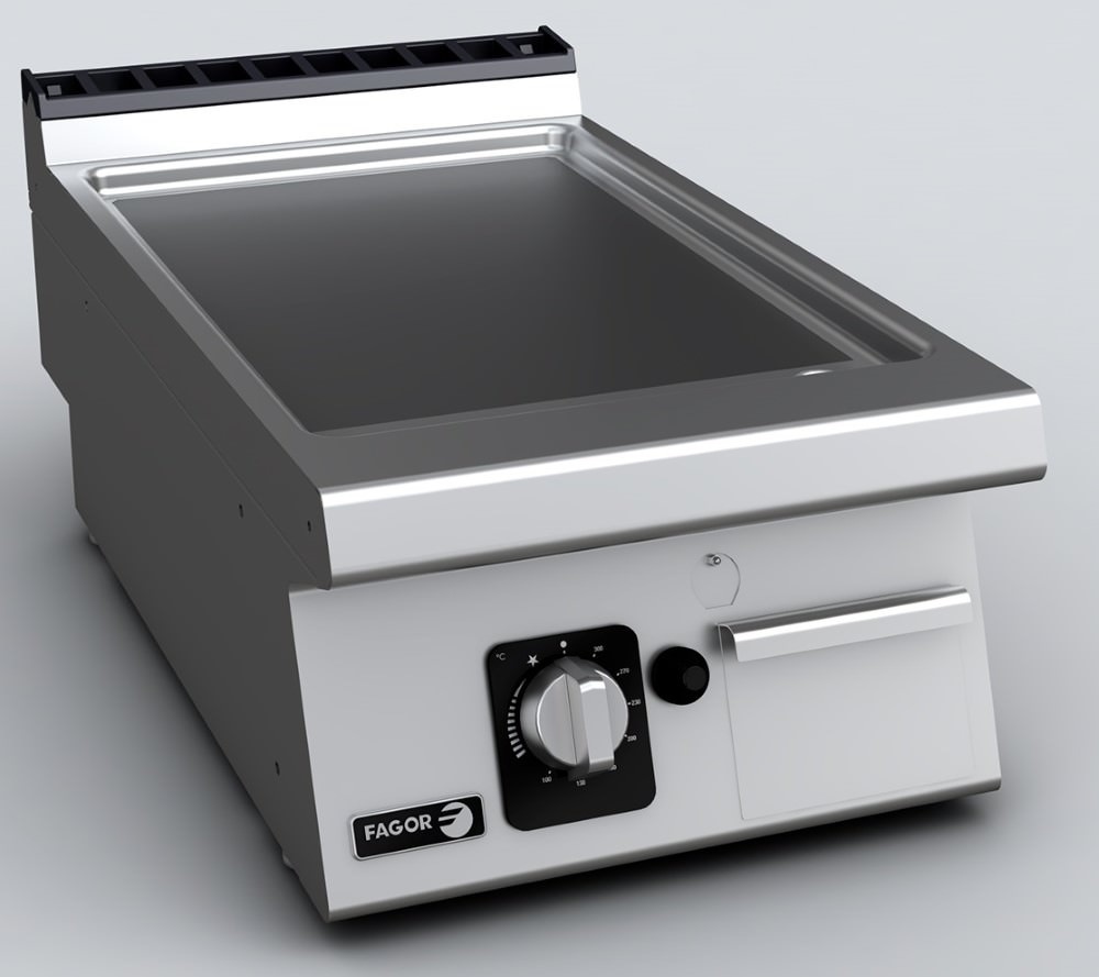 Głęboko tłoczone blaty wykonane ze stali nierdzewnej AISI-304 o grubości 1,5 mm. Powierzchnia do smażenia o grubości 12 lub 15 mm ze stali miękkiej, która szybko się nagrzewa i ma dużą moc. Płyty do smażenia z pełnym modułem mają dwa oddzielne obszary grzewcze. Szybkie czasy reakcji i odzysku temperatury smażenia. Płyty do smażenia są przyspawane do głęboko tłoczonej powierzchni. Głęboko tłoczona płyta oraz zaokrąglone krawędzie i rogi znacznie ułatwiają czyszczenie. Płyta do smażenia jest pochylona do przodu, aby ułatwić zbieranie tłuszczu i płynów. Wyposażony w otwór do zbierania tłuszczu kuchennego i tacę do przechowywania, która może pomieścić do 2 litrów w zależności od modelu. Dostęp do komponentów od przodu. Urządzenia z ochroną przed wodą klasy IPX5. Modele ogrzewane elektrycznie z elementami grzewczymi ze stali nierdzewnej; termostatyczna kontrola temperatury, między 100 a 300 ° C. Model z ryflowaną płytą o wymiarach 328 x 468 mm.Podmiot odpowiedzialny (GPSR):