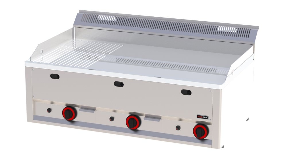 Gazowa płyta grillowa 480 x 970 mm, 2/3 gładka, 1/3 ryflowana, chromowana, 3 strefy grzewcze, 12 kW, nastawna