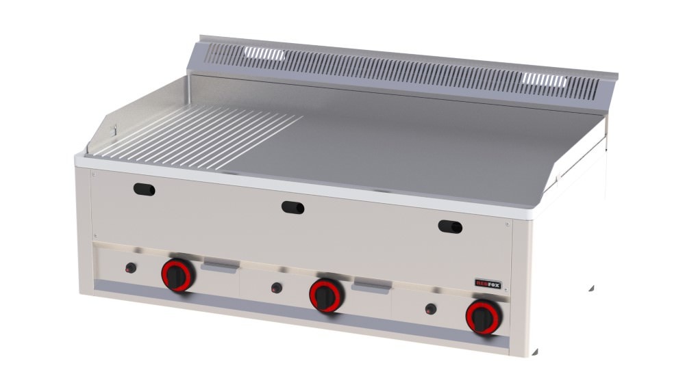 Gazowa płyta grillowa 480 x 970 mm, 2/3 gładka, żeliwna, 1/3 ryflowana, żeliwna, 3 strefy grzewcze, 12 kW, nastawna