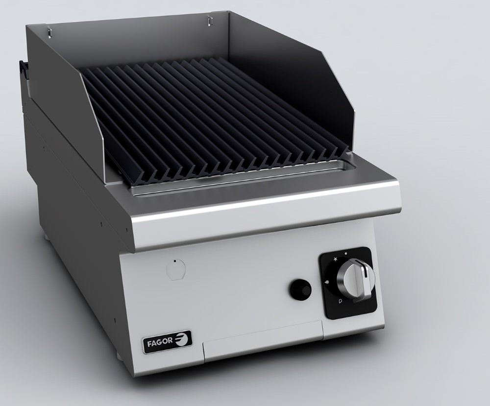 Głęboko tłoczone blaty wykonane ze stali nierdzewnej AISI-304 o grubości 1,5 mm. Wyposażony w otwór do zbierania tłuszczu kuchennego i tacę do przechowywania resztek. Urządzenia są wyposażone w zdejmowane osłony o wysokości 130 mm zapobiegające rozpryskom, wykonane ze stali nierdzewnej. Grupa dwóch wysokowydajnych palników rurowych (jedna grupa dwóch palników na pół modułu). Niezależne sterowanie dla każdej grupy palników poprzez zawór bezpieczeństwa z termoparą. Zapłon palnika za pomocą elektronicznego zapłonnika iskrowego. Palniki ogrzewają kamienie ceramiczne znajdujące się pod rusztem nośnym, aby z kolei podgrzewać potrawę na grillu. Ruszty żeliwne, które można wyjmować bez użycia narzędzi, w modułach o szerokości 170 mm Ruszty żeliwne są dwustronne z dwiema różnymi wykończeniami pokażdej stronie: Pochylony i ryflowany z grzbietami na mięso oraz Poziomy i płaski dla ryb i warzyw. Grille te osiągają bardzo wysoką temperaturę (400 ° C), co oznacza, że powierzchnia produktu jest szybko chrupiąca, a wewnątrz pozostaje znacznie bardziej soczysta. Dwa ruszty i o wymiarach 515 x 172 mm na każde pół modułu.Podmiot odpowiedzialny (GPSR):