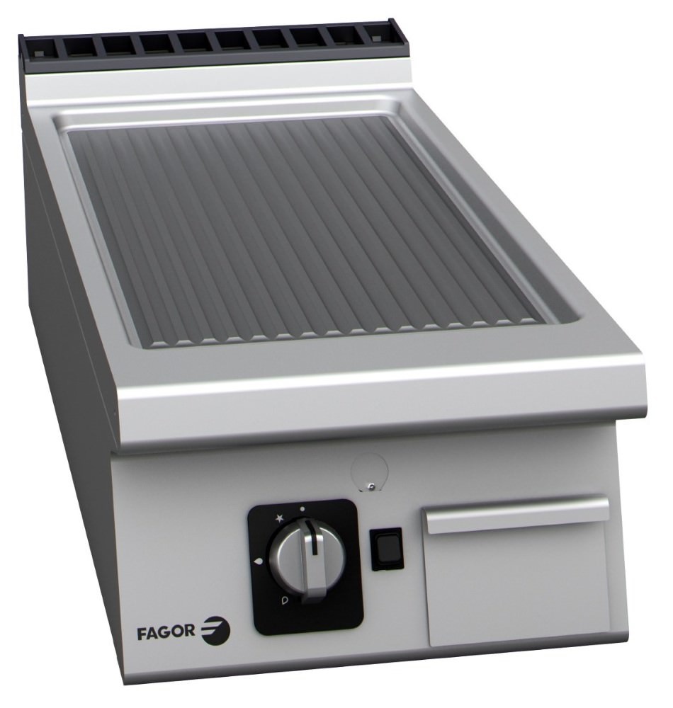 Płyta grillowa ryflowana, Palniki rurowe pod płytą grillową wykonane ze stali nierdzewnej z płomieniem kontrolnym i termoparą. Piezoelektryczne odpalanie palników. Temperatura płyty sterowana termostatem (120–310°C). Zbiornik tłuszczu o dużej objętości znajdujący się pod płytą grillową.Podmiot odpowiedzialny (GPSR):
