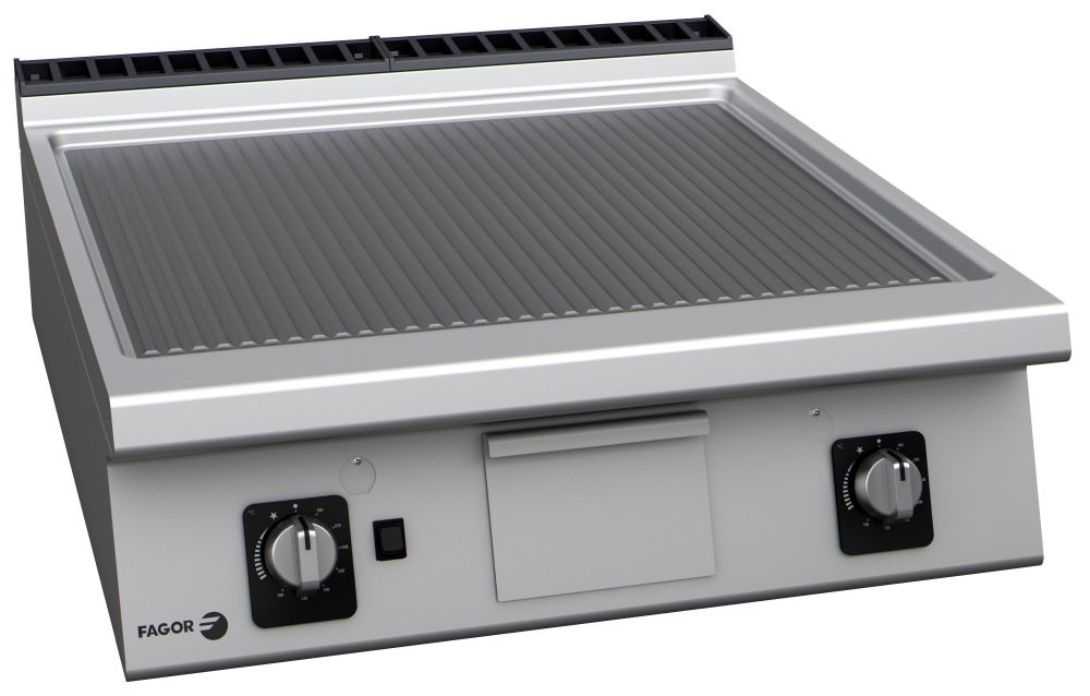 Płyta grillowa ryflowana, Palniki rurowe pod płytą grillową wykonane ze stali nierdzewnej z płomieniem kontrolnym i termoparą. Piezoelektryczne odpalanie palników. Temperatura płyty sterowana termostatem (120–310°C). Zbiornik tłuszczu o dużej objętości znajdujący się pod płytą grillową. Płyta pokryta 50-mikronową warstwą chromu; zmniejszona emisja ciepła do otoczenia, lepszy komfort pracy, produkty grillowane nie przywierają do płyty.Podmiot odpowiedzialny (GPSR):