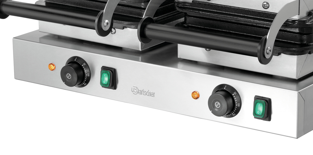 Gofrownica z 2 jednostkami odpiekowymi w kształcie gofra brukselskiego wyróżnia się nie tylko dobrą przewodnością ciepła żeliwnych płyt grzewczych, solidnym wykonaniem i wysoką wydajnością. Dwa osobne włączniki/wyłączniki umożliwiają ponadto nieskomplikowane i dostosowane do potrzeb użytkowanie.