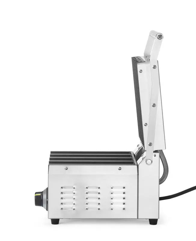 Obudowa wykonana z wytrzymałej stali nierdzewnej gwarantuje trwałość, odporność na intensywne użytkowanie oraz łatwe utrzymanie higieny. Pokrywa grilla zamontowana jest na solidnych zawiasach i otwiera się pod kątem do 90°, co ułatwia obsługę oraz czyszczenie. Nienagrzewający się uchwyt zwiększa bezpieczeństwo użytkowania.
