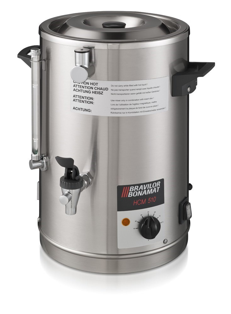 Urządzenie do podgrzewana czekolady z systemem Bain-Marie. Elektryczne podgrzewanie z ręczną regulacją temperatury, zabezpieczeniem przed brakiem cieczy, wskaźnikiem poziomu cieczy, niekapiącym kranikiem i mieszadłem automatycznym. Nie wymaga podłączenia do sieci wodociągowej.