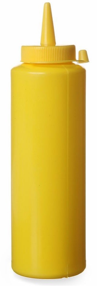 Wykonany z trwałych i bezpiecznych materiałów – korpus z PET umożliwia szybką kontrolę poziomu zawartości, a zakrętka z polipropylenu (PP) w kolorze żółtym pozwala na łatwą identyfikację zawartości (np. musztardy). Smukły kształt i niewielka średnica ułatwiają ustawienie wielu dozowników obok siebie, a ergonomiczna konstrukcja zapewnia wygodne użytkowanie nawet w intensywnych warunkach pracy.