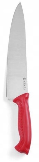 Profesjonalny nóż kucharski HACCP do surowego mięsa. Rączka w kolorze czerwonym ułatwia rozpoznanie noża w kuchni. Noże Hendi charakteryzują się wysoką jakością oraz uniwersalnością, prezentowany model rekomendowany jest do użytku w restauracjach i barach, można stosować również w domowej kuchni.
