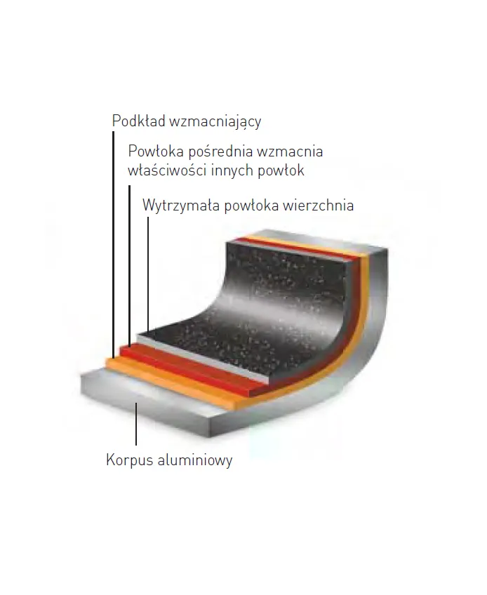- Powłoka „marmurkowa” zapobiegająca przywieraniu charakteryzuje się odpornością na wysoką temperaturę (do +260°C). Powłoka nakładana jest w trzech warstwach, co zwiększa jej odporność na zużycie