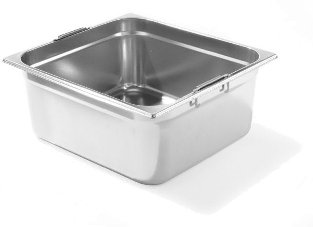 Pojemnik GN 2/3 z chowanymi uchwytami ułatwiającymi przenoszenie, wykonany ze stali nierdzewnej. Produkt charakteryzuje się bardzo dobrą jakością wykonania.
