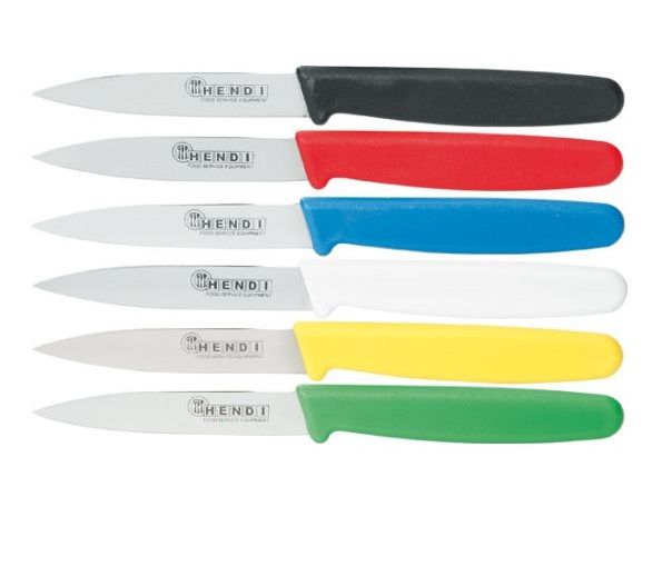 Profesjonalne nożyki HACCP do obierania. Rączki w różnych kolorach ułatwiają rozpoznanie noży w kuchni. Noże Hendi charakteryzują się wysoką jakością oraz uniwersalnością, prezentowany zestaw rekomendowany jest do użytku w restauracjach i barach, można stosować również w domowej kuchni.