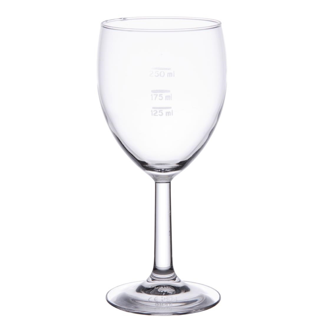 Kieliszki do wina z obniżoną nóżką i smukłym kształtem, idealne dla lokali z koncesją, firm cateringowych oraz dużych obiektów eventowych Oznaczenie CE przy 125 ml, 175 ml i 250 ml.