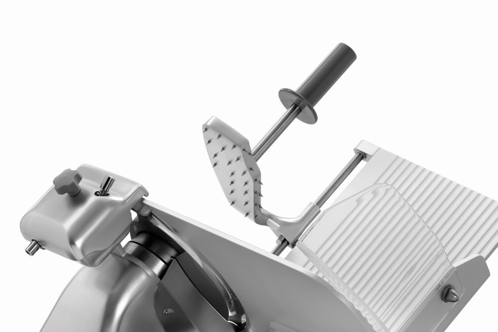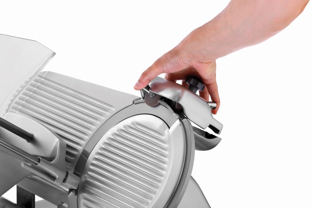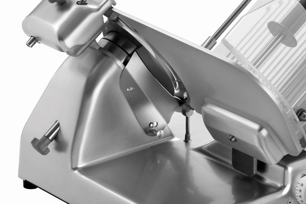 Wysoka wydajność i bezobsługowość w zakresie konserwacji – krajalnica z przekładnią do profesjonalnego użytku w kuchniach gastronomicznych i zakładach masarskich. Przystosowana do krojenia wędlin i serów.