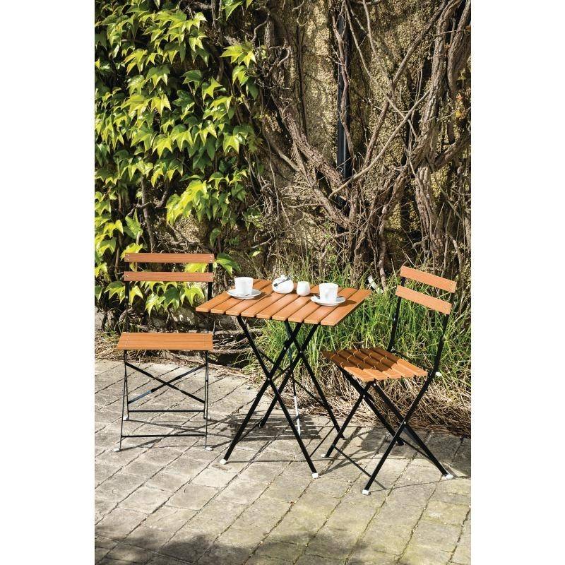 Tradycyjne, składane krzesła, które świetnie się sprawdzą na patiach czy tarasach. Krzesła wykonano z lakierowanej stali i imitacji drewna. Zestaw zawiera 2 sztuki.