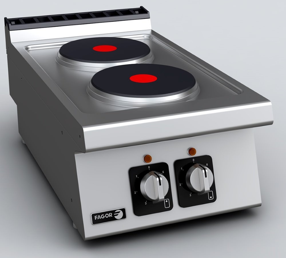Tłoczone blaty wykonane ze stali nierdzewnej AISI-304 o grubości 1,5 mm, z zaokrąglonymi krawędziami, zaprojektowane tak, aby zapobiec przedostawaniu się rozlanej cieczy z patelni do wnętrza. Głęboko tłoczona powierzchnia z zaokrąglonymi narożnikami dla łatwegoczyszczenia. Regulacja mocy za pomocą selektora z 7 pozycjami. Ochrona przed przegrzaniem dla każdej płyty. Dostęp do komponentów od przodu. Urządzenia z ochroną przed wodą klasy IPX5.Dwie okrągłe żeliwne płyty grzejne o średnicy 223 mm, o mocy 2,6 kW, hermetycznie przymocowane do głęboko tłoczonej powierzchni górnej.Podmiot odpowiedzialny (GPSR):
