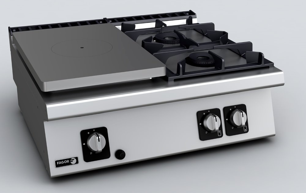 Głęboko tłoczone blaty wykonane ze stali nierdzewnej AISI-304 o grubości 1,5 mm. Połączenia wycinane laserowo i automatycznie spawane. Podwójne ruszty o wymiarach 397 x 580 mm (397 x 290 mm na każdy palnik), umożliwiające stosowanie dużych garnków i patelni. Zmniejszona odległość 75 mm między środkowymi prętami umożliwia stosowanie garnków o bardzo małej średnicy (8 cm), unikając ryzyka przewrócenia się mniejszych naczyń. Palniki wykonane są z żeliwa emaliowanego RAAF (odporne na produkty alkaliczne i kwasowe, ogień i wysokie temperatury).Palniki i dyfuzory z podwójną koroną wykonane z niklowanego żeliwa, które gwarantują równomierne rozprowadzenie ciepła z płomienia do podstawy naczyń, nawet w przypadku dużych naczyń. Elastyczne rury gazowe ze stali nierdzewnej, ułatwiające wewnętrznemanipulacje w celu ułatwienia napraw. Dostęp do komponentów serwisowych od przodu. Żeliwna płyta po lewej stronie o grubości 10 mm z zaokrąglonymi narożnikami, 400 x 580 mm i tarczą o średnicy 210 mm. Dwa palniki i żeliwna płyta o grubości 10 mm na blacie, o różnychmocach, umożliwiająca stosowanie różnych garnków i patelni oraz różnych potraw: 1 x 5,25 kW (Ø 100 mm) + 1 x 8,0 kW ( Ø 120 mm). Palnik 5,25 kW pod blatem do smażenia.Podmiot odpowiedzialny (GPSR):