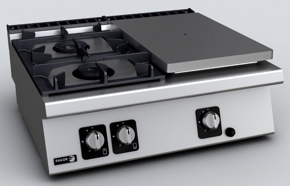 Głęboko tłoczone blaty wykonane ze stali nierdzewnej AISI-304 o grubości 1,5 mm. Podwójne ruszty o wymiarach 397 x 580 mm (397 x 290 mm na każdy palnik), umożliwiające stosowanie dużych garnków i patelni. Zmniejszona odległość 75 mm między środkowymi prętami umożliwia stosowanie garnków o bardzo małej średnicy (8 cm), unikając ryzyka przewrócenia się mniejszych naczyń. Palniki wykonane są z żeliwa emaliowanego RAAF (odporne na produkty alkaliczne i kwasowe, ogień i wysokie temperatury). Palniki i dyfuzory z podwójną koroną wykonane z niklowanego żeliwa, które gwarantują równomierne rozprowadzenie ciepła z płomienia do podstawy naczyń, nawet w przypadku dużych naczyń. Elastyczne rury gazowe ze stali nierdzewnej, ułatwiające wewnętrzne manipulacje w celu ułatwienia napraw. Dostęp do komponentów serwisowych od przodu. Żeliwna płyta po prawej stronie o grubości 10 mm z zaokrąglonymi narożnikami, 400 x 580 mm i tarczą o średnicy 210 mm. Dwa palniki i żeliwna płyta o grubości 10 mm na blacie, o różnych mocach, umożliwiająca stosowanie różnych garnków i patelni oraz różnych potraw: 1 x 5,25 kW (Ø 100 mm) + 1 x 8,0 kW ( Ø 120 mm). Palnik 5,25 kW pod blatem do smażenia.Podmiot odpowiedzialny (GPSR):