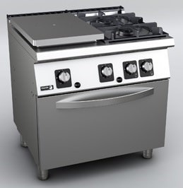 Głęboko tłoczone blaty wykonane ze stali nierdzewnej AISI-304 o grubości 1,5 mm. Połączenia wycinane laserowo i automatycznie spawane. Podwójne ruszty o wymiarach 397 x 580 mm (397 x 290 mm na każdy palnik), umożliwiające stosowanie dużych garnków i patelni. Zmniejszona odległość 75 mm między środkowymi prętami umożliwia stosowanie garnków o bardzo małej średnicy (8 cm), unikając ryzyka przewrócenia się mniejszych naczyń. Palniki wykonane są z żeliwa emaliowanego RAAF (odporne na produkty alkaliczne i kwasowe, ogień i wysokie temperatury).Palniki i dyfuzory z podwójną koroną wykonane z niklowanego żeliwa, które gwarantują równomierne rozprowadzenie ciepła z płomienia do podstawy naczyń, nawet w przypadku dużych naczyń. Elastyczne rury gazowe ze stali nierdzewnej, ułatwiające wewnętrznemanipulacje w celu ułatwienia napraw. Dostęp do komponentów serwisowych od przodu. Żeliwna płyta po lewej stronie o grubości 10 mm z zaokrąglonymi narożnikami, 400 x 580 mm i tarczą o średnicy 210 mm. Dwa palniki i żeliwna płyta o grubości 10 mm na blacie, o różnychmocach, umożliwiająca stosowanie różnych garnków i patelni oraz różnych potraw: 1 x 5,25 kW (Ø 100 mm) + 1 x 8,0 kW ( Ø 120 mm). Palnik 5,25 kW pod blatem do smażenia. PIEKARNIK GAZOWY Z WYMIARAMI GN-2/1. Komora piekarnika wykonana w całości ze stali nierdzewnej, Moc grzewcza 8,60 kW. Zawór termostatyczny do kontroli temperatury (125 - 310 ° C).Podmiot odpowiedzialny (GPSR):