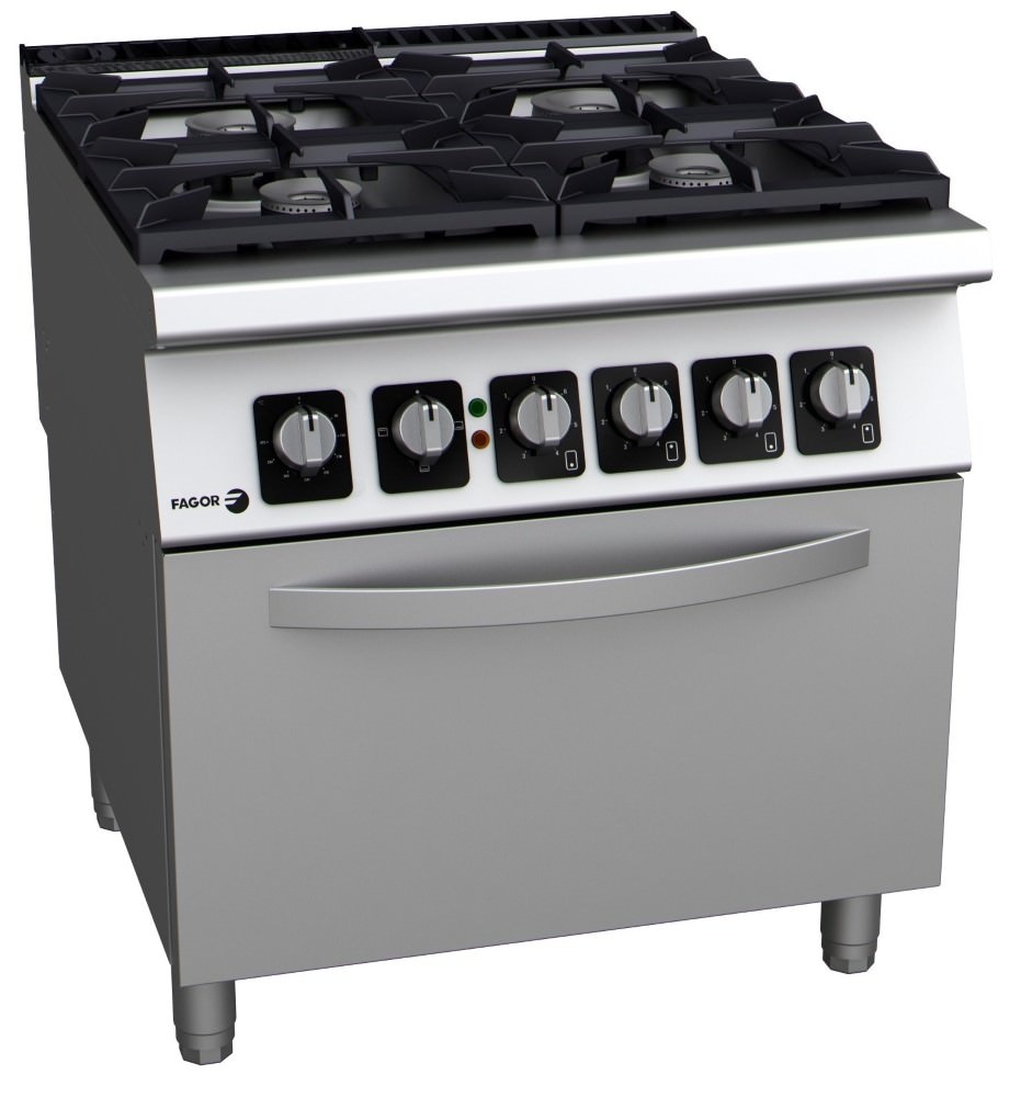 4 palniki o dwukoronowej budowie, zapewniające dużą moc i wysoką sprawność. Palniki nawierzchniowe z zaworami bezpieczeństwa i termoparami. Ruszty i palniki wykonane z żeliwa. Rynny ociekowe o pojemności 1,5 dm3 pod palnikami, łatwo wyjmowane, stanowiące integralną część urządzenia. Piekarnik elektryczny z rusztem GN 2/1 (650 x 520 mm) z dolnymi i górnymi elementami grzejnymi. Wymiary piekarnika: 520 x 650 x 300 mm. Przełącznik wyboru elementów grzejnych. Piekarnik sterowany termostatem w zakresie 55–350°C.Podmiot odpowiedzialny (GPSR):