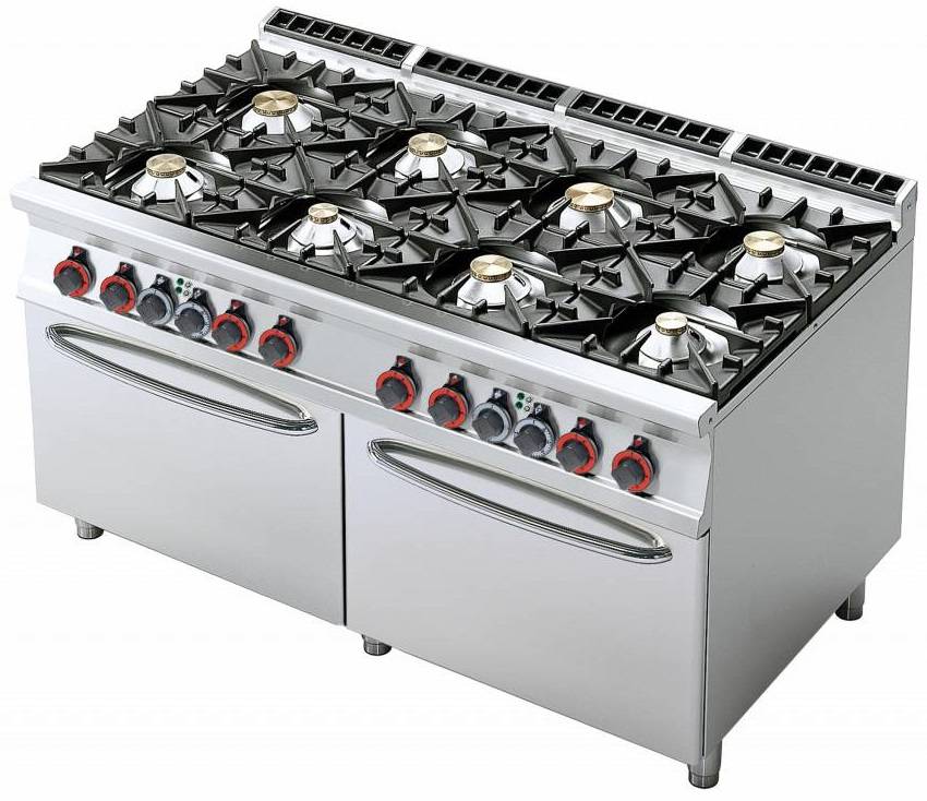 Kuchnia gazowa z 8 palnikami i dwoma piekarnikami elektrycznymi GN 2/1, 90 kW
